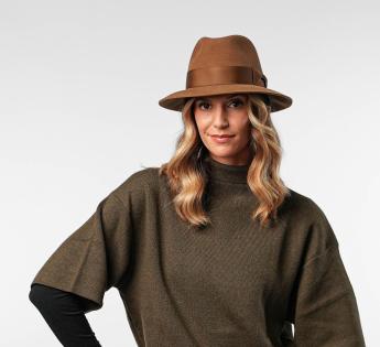 Fabriqué à la main en Italie, ce chapeau en feutre poils incarne le sommet du raffinement. Son feutre brossé révèle un fini velouté, qui accroche la lumière et souligne ses traits délicats. Garni par un large gros-grain à nœud classique, le chapeau est ponctué d’une plaque siglée Guerra 1855, gage d’un savoir-faire artisanal hors pair.