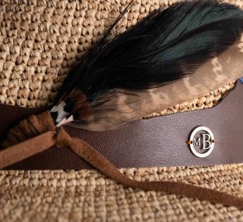 Ce Traveller en raphia crocheté se distingue par sa ceinture de cuir découpée, dont le relief dessine une chaîne de montagnes à l'horizon. Ce savant mélange de matières, cuir, suédine et plume naturelle, évoque la beauté simple d’un paysage sauvage.