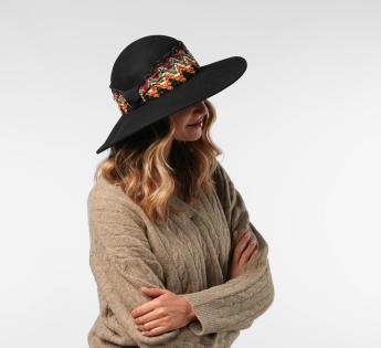 Capeline en laine feutrée fabriquée en Italie, à la silhouette souple et élégante. Elle se distingue par une garniture tressée aux motifs zigzag multicolores, qui apporte une touche bohème et lumineuse à l’ensemble. Un jeu de textures saisissant pour un chapeau plein de personnalité.