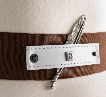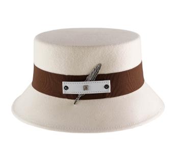 Audacieux et structuré, ce bob en feutre de laine séduit par son allure contemporaine. Il est habillé d’un large galon en gros-grain orné d'une garniture métallique en forme de plume, fixée sur une patte en cuir surpiqué.