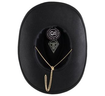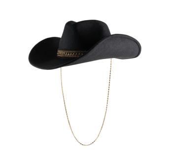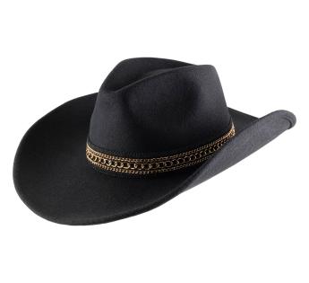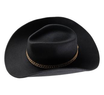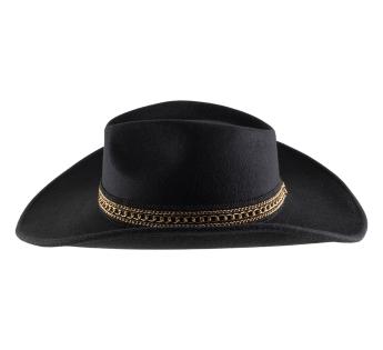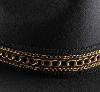 Confectionné en feutre de laine, il est à la fois chaud, imperméable et durable. Le galon orné de chaînettes dorées ajoute une touche lumineuse et contrastée, entre classicisme et audace. La fine jugulaire style chaînette souligne son caractère et permet un port plus assuré.