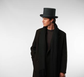 Ce haut-de-forme en feutre de laine durci incarne l’élégance dans sa forme la plus pure. Sa calotte haute, volontairement accentuée, crée une ligne verticale majestueuse, signature des grandes silhouettes d’apparat. Le feutre rigide, travaillé avec précision, assure un maintien irréprochable et une finition soignée.