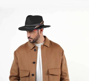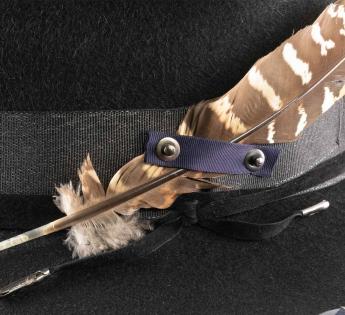 Chapeau traveller dont l'ensemble met en scène un mélange de matières avec du feutre, du métal, du satin gros grain qu'agrémente une plume. Sa calotte de hauteur standard s'unit à son bord plutôt large pour bien protéger du froid et faire de l'ombre aux yeux. Il nous offrira chaleur et confort grâce à sa matière dense.