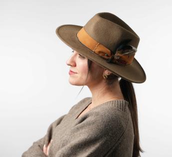 L'association de différentes matières et textures est l'une des pratiques à la mode cette saison. Voyez par vous-même avec cette combinaison feutre-daim bien pensée. Le résultat est un chapeau classique relevé d'un galon à la couleur gaie naturelle et affichant de façon réussie des surpiqûres, fantaisies et une plume. Nous profitons ainsi d'une création à laquelle il a été ajouté une belle touche de brillance.