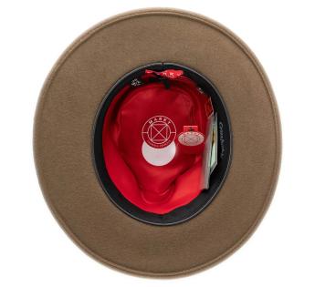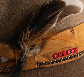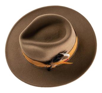 L'association de différentes matières et textures est l'une des pratiques à la mode cette saison. Voyez par vous-même avec cette combinaison feutre-daim bien pensée. Le résultat est un chapeau classique relevé d'un galon à la couleur gaie naturelle et affichant de façon réussie des surpiqûres, fantaisies et une plume. Nous profitons ainsi d'une création à laquelle il a été ajouté une belle touche de brillance.