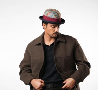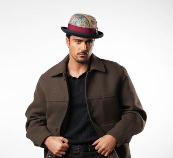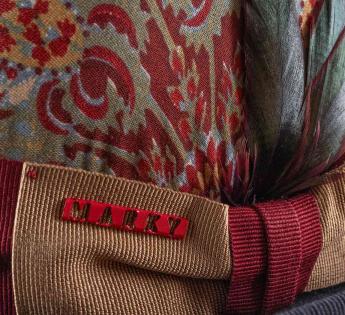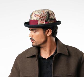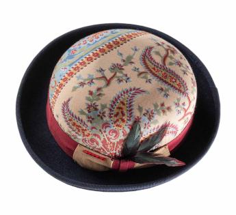 Pièce forte en édition limitée, ce melon recouvert d’un tissu vintage au motif cachemire se distingue par son allure unique. Chaque exemplaire présente un placement de motif différent, rendant chaque chapeau véritablement singulier. Une garniture travaillée, rehaussée d’un galon bicolore et d’une plume de coq aux reflets verts et bordeaux, signe une silhouette audacieuse et raffinée.