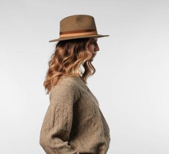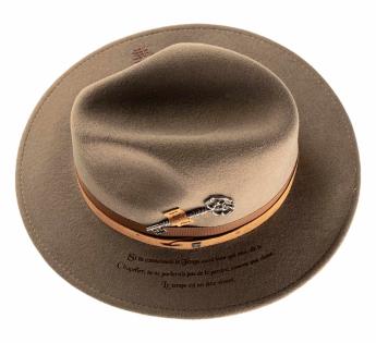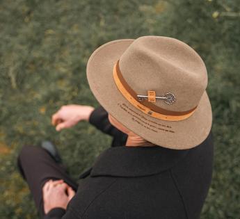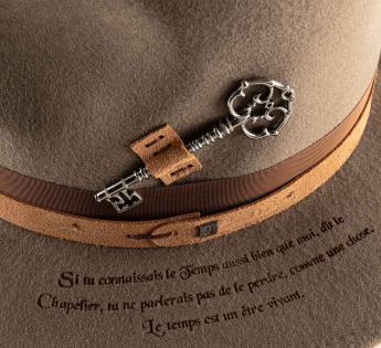 Entièrement façonné dans un feutre de laine dense et structuré, ce modèle revisite la forme classique du traveller à travers une esthétique symbolique inspirée de l’univers poétique de Lewis Carroll. Une clé ancienne, fixée en lieu et place de la plume traditionnelle, devient l’emblème du mystère du temps, un clin d’œil direct au Chapelier fou d’Alice.