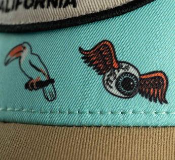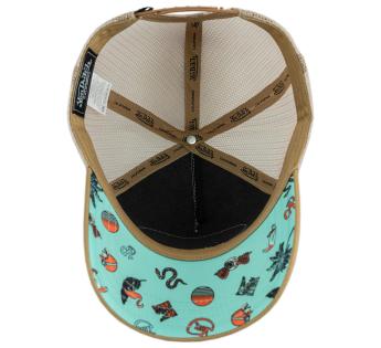 Cette casquette évoque aussitôt les beaux jours, la plage, les activités en plein air et cette lumière dorée des fins de journée. Ses motifs composent un véritable cocktail d’ambiances californien et insuffle à la silhouette un esprit libre, solaire et résolument estival.