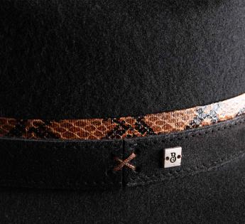 La garniture effet serpent, relevée d’une griffe métallique, signe un style affirmé, à la frontière du rustique et du raffiné. Ce modèle s’inspire des légendes de l’Ouest tout en gardant une élégance bien française. Un couvre-chef de caractère, prêt à tracer sa route entre tradition artisanale et esprit aventurier.